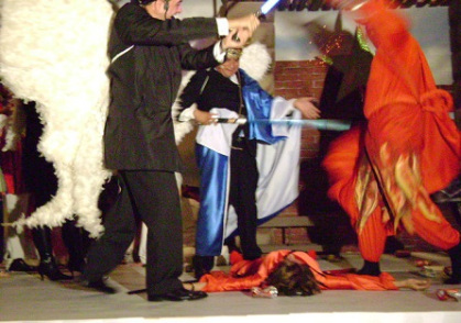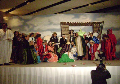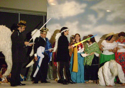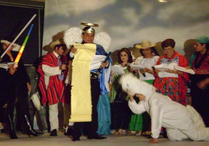 Arcángeles, diablos, pastoras y mulas, sin faltar la Vírgen y San José, aparecieron en escena en una representación magistral, cómica, muy bien llevada y que el Presidente de México, Felipe Calderón Hinojosa y su señora esposa, así como el Secretario de Gobernación Don Francisco Ramírez Acuña y otros altos funcionarios, pudieron disfrutar al máximo. Felipe en su calidad de Arcángel Anunciador y ataviado con alas, capa azul y blanco, aureola y una poderosísima espada de la Guerra de las Galaxias que emitía fatales rayos láser, en el desarrollo de su personaje pudo anunciar la aprobación del presupuesto, tan esperado por todos y que, finalmente, constituía la buena nueva que al unísono todo mundo ansiaba; poco después se enfrascó en una terrible lucha con los representantes infernales, los temidos diablos, representados por sus compañeros Éctor Jaime Ramírez Barba, Elia Hernández Núñez y Dora Alicia Martínez Valero a quienes, junto con sus otros dos compañeros Arcángeles, vencieron hasta dejarlos tirados en el piso. Todo cobró calma y apareció el pesebre donde la Diputada María Eugenia Campos Galván arrullaba en su pesebre al Niño Dios.